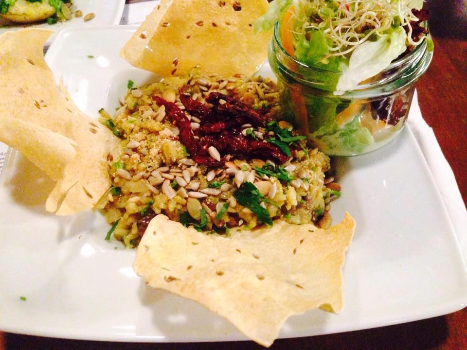 My decydujemy się na dwie pozycje. Pierwszą jest Cudak (29 zł), czyli nadziewane ziemniaki z farszem z nerkowców, tofu, szczypiorku i migdałów, a wszystko to zapiekane z Tempehem i sosem orzechowo-serowym. Do tego dostajemy klasyczną surówkę z vinegretem, tzn. wydawało mi się, że miała być klasyczna. Od niej właśnie zacznę. Króciutko – świeże warzywa z dressingiem z dziwnym posmakiem anyżu. Nie wiem skąd ten posmak, ale oboje go wyczuliśmy. Do samego dania głównego nie mam żadnych zastrzeżeń. Mięciutkie w środku ziemniaki, z kremowym farszem. Farsz raczej troszkę bezpłciowy, ale górna szczypiorkowa pierzynka nadawała mu zdecydowanego smaku. Co to jest Tempeh – nie wiem, ale smakuje troszkę jak kabanos.