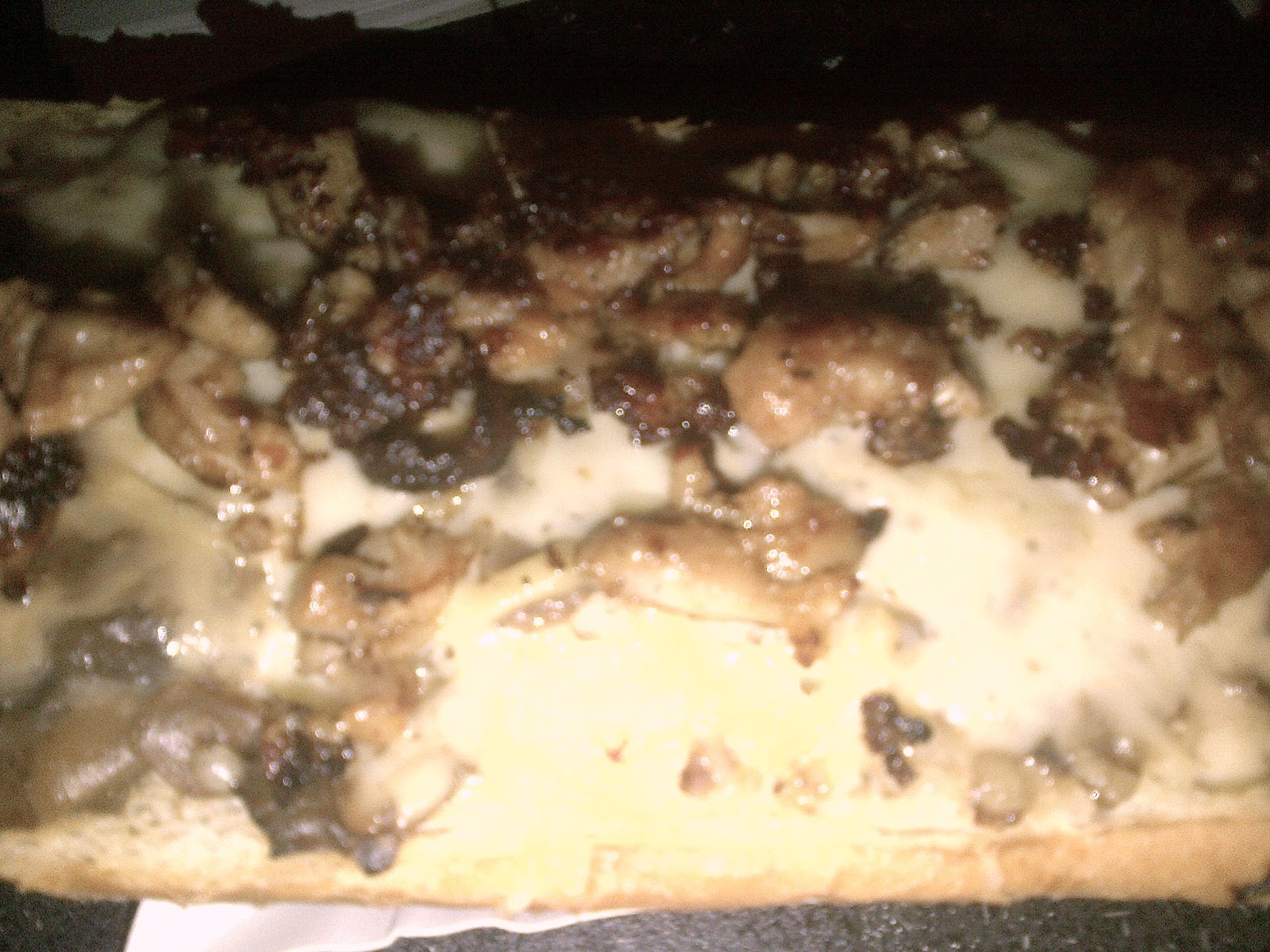 Jak widać – solidny kawał buły. Na nim pieczarki i ser, a na tym mięso z kebabowego kurczaka.