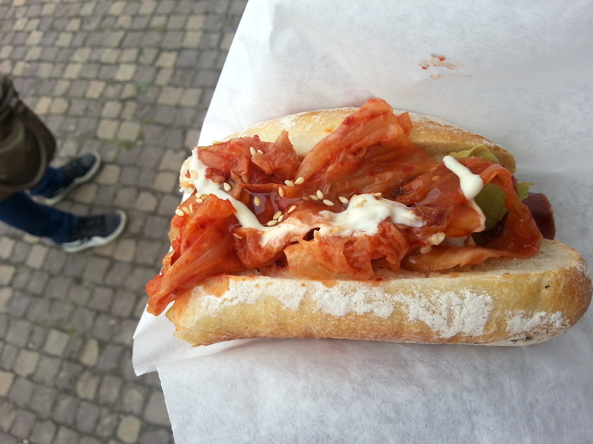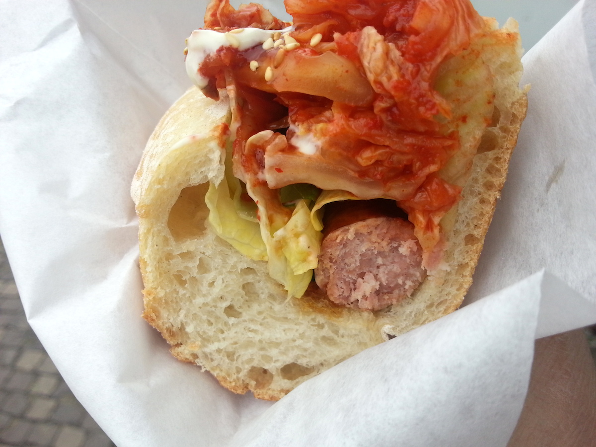 Na koniec dorzucę jeszcze kilka słów. Padły na naszym fan page zarzuty, że menu za krótkie, ceny za wysokie a bułka fatalna. Po kolei. Wolę krótkie, ale sensowne menu niż rozbudowane i powtarzające smaki. Podczas ZNK w menu były tylko dwa hot dogi, ale za to na tyle inne od tych, które można kupić gdziekolwiek indziej, że wynagrodziły skąpą ofertę. Cena. 14 zł to faktycznie nie mało, ale po pierwsze teraz kosztują już 12 zł, a po drugie jeśli coś jest dobre, to warto tyle zapłacić. Za hot doga w Soul Food Busie płaciłem więcej i tez nie miałem poczucia źle wydanych pieniędzy. No sorry, ale dobra kiełbasa musi kosztować, a w japadogach mamy do czynienia z taką właśnie – dobrą, podwędzaną kiełbasą, a nie parówką. Bułka – ja akurat lubię takie solidne, grube buły, ale w przypadku japadogów chodzi o coś jeszcze. Spróbujcie zapakować taką ilość dodatków do klasycznej bułki hot dogowej. Pewnie na upartego się da, ale ktoś kto miał do czynienia z kimchi ten wie, jak kapusta ta potrafi brudzić.