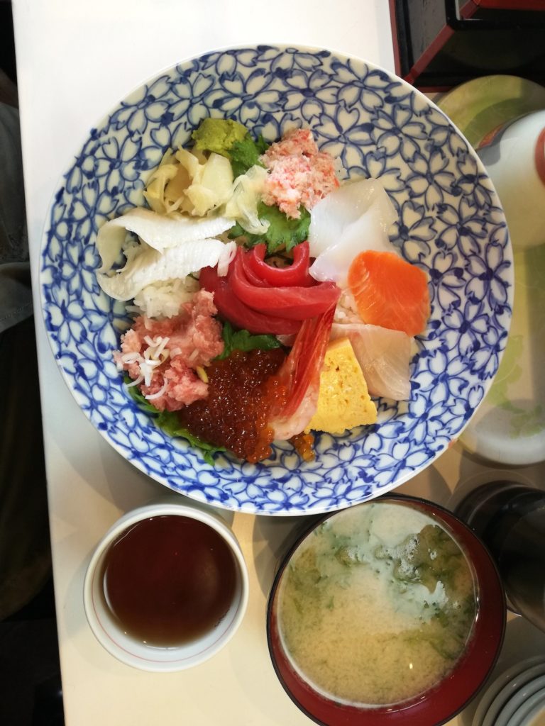 Chirasi sushi na zewnętrznym bazarze przy Tsukiji Market, Tokio