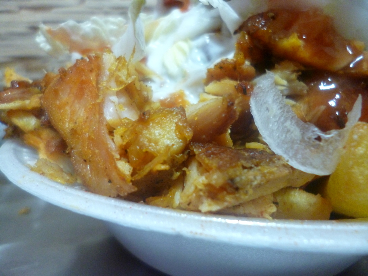 Mięso chłodne. Wpływ na to miała zarówno temperatura sosów i warzyw, jak i fakt, że zostało skrojone wcześniej i czekało na frytki. Kawałki prawdopodobnie pochodzące z kurczaka z rożna – sposób doprawienia i struktura mięsa każą mi sądzić, że w ten właśnie sposób został przygotowany kebab. Niektóre kawałki twarde, wręcz suche, inne dość soczyste, ale włókniste. Wielkość bardzo zróżnicowana – od sporych plasterków po malutkie kawałeczki. Na 99% mięso nie pochodziło z obrotowej beli. Z jednej strony można to potraktować jako plus – mięso smakuje inaczej niż typowy kebab drobiowy, z drugiej nie każdy lubi kurczaka z rożna, wg mnie mięso było wyraźnie mniej soczyste i zwarte niż klasyczny kebab z beli.