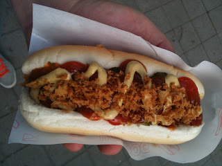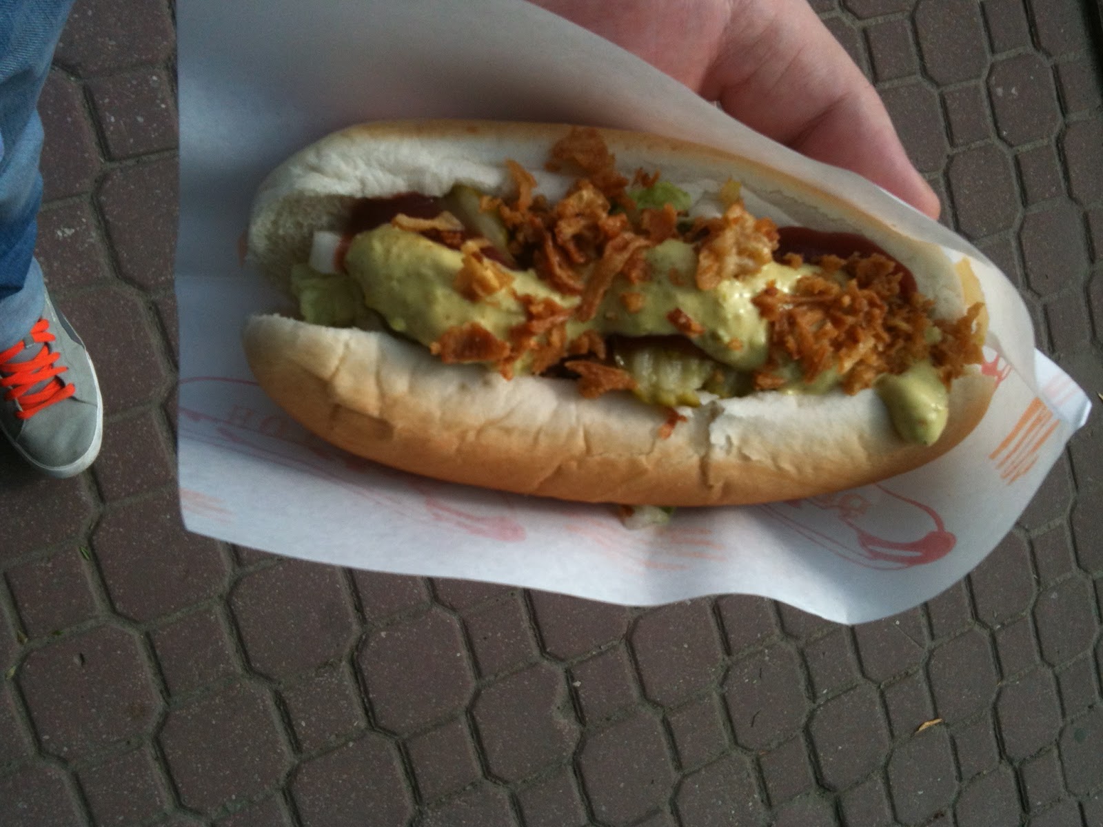 Jak widać, jest niemal identyczny jak ten na Żytniej. Ale nie do końca. W tym bowiem znajdziemy więcej dodatków. Bułka – podobnie, jak na Żytniej gorąca i mięciutka, bardzo dobra. Parówka – również wieprzowa i soczysta, również pyszna. Dodatki: na parówce znajdziemy roztopiony ser, warzywa (kapusta pekińska, pomidor, ogórek konserwowy), ketchup i remuladę oraz prażoną cebulkę.