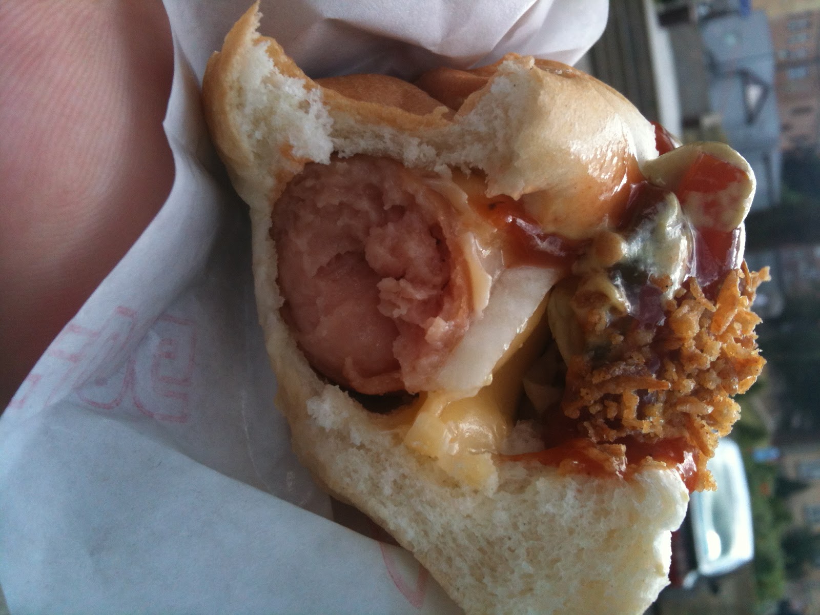 Ja zdecydowałem się na hot doga z serem (3,50 zł + 0,50 zł ser), czyli takiego, jakiego nie udało mi się kupić tutaj poprzednio. Zapłaciłem 4 zł i po 2 minutach w moich łapkach wylądował gorący hot dog: