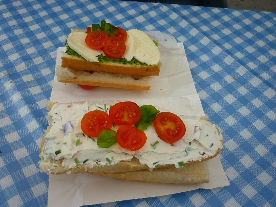 Po spacerze tam i z powrotem, zdecydowaliśmy się z Przyjacielem najpierw na proste kanapki, niestety nie pamiętam kto je dla nas przygotował. Dobre, tradycyjne pieczywo a nie puste w środku hipermarketowe bułki, świeże pesto z mozarellą i pomidorami a na drugiej kanapce serek homogenizowany z dodatkiem rzodkiewki i szczypiorku. Obie kanapki doskonałe.