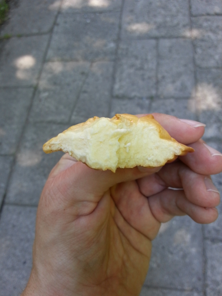 Tym razem wprawdzie trafił mi się przysmak ubrudzony jedynie jagodami z zewnątrz a w środku znalazłem jabłkowe nadzienie, ale nie narzekałem. Było pysznie. Moja Partnerka w tym czasie jadła wielkiego kapuśniaczka z Piekarni Monika Binkowska i również była bardzo zadowolona.