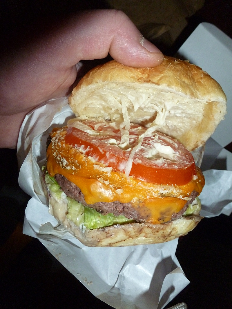 Bułka – perfekcja. Idealnie trzymała całość od pierwszego do ostatniego kęsa, nic z niej nie wypadło, ani niczym się nie upaćkałem. :) Poza tym, świetna w smaku i nie dominuje tego co najważniejsze – mięsa. To chyba właśnie dlatego ten burger ochrzczono mianem „królewskiego”. Nie jest to podwójny kotlet, tylko jeden wielki 250-gramowiec. Cały czas jest wyczuwalny i gra pierwsze skrzypce, tak jak być powinno. Sałata czasem chrupnie, serek ładnie się ciągnie, a cebula (zwłaszcza czerwona) dodaje ostrości, którą łagodzi pomidor. Odnosiłem wrażenie, że sos również jest łagodno-ostry (?), ale o to już nie mnie pytać. Pycha!