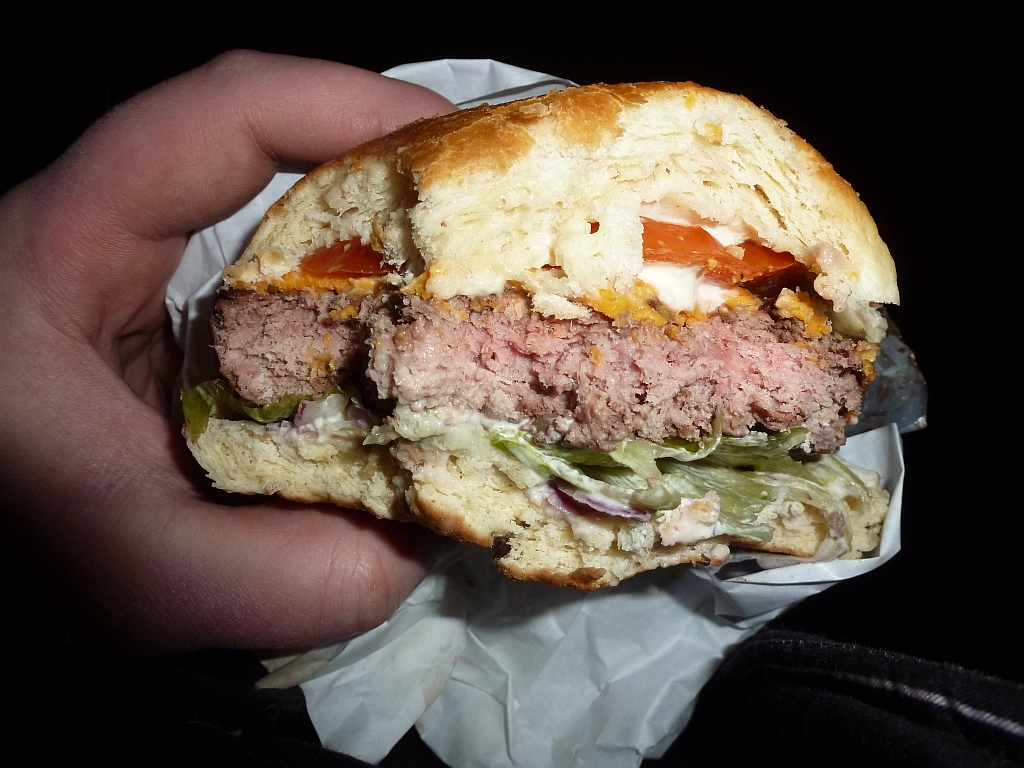 Zajrzałem pod „kapelusik”. Co my tam mamy? Od dołu czerwona cebulka i sałata, 250 gram świetnej wołowiny (wg informacji pozyskanych – z dodatkiem bekonu), na tym podwójny ser Mimolette, pomidor i zwykła cebula. I oczywiście firmowy sos.
