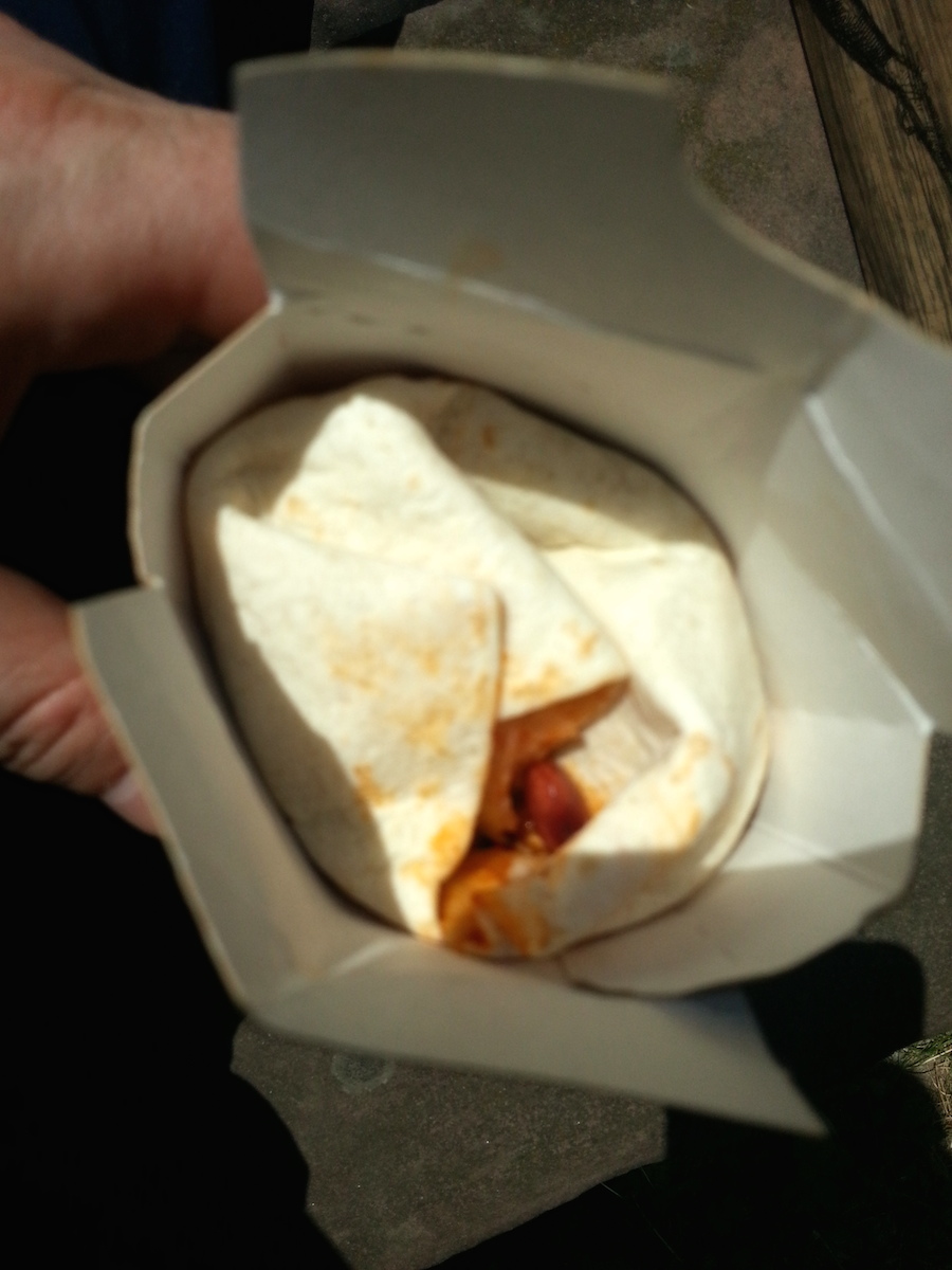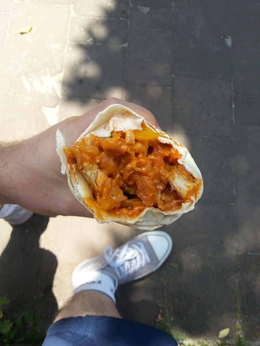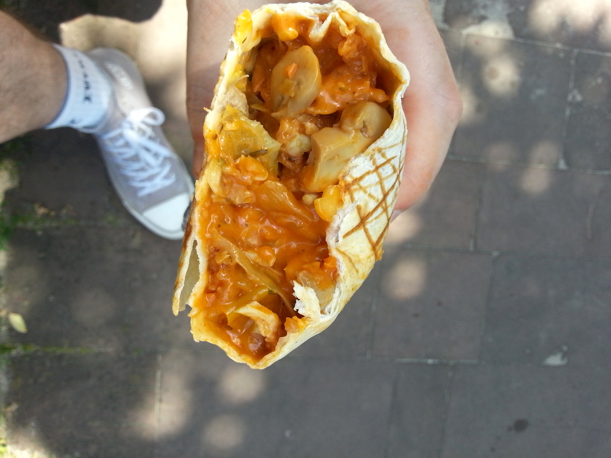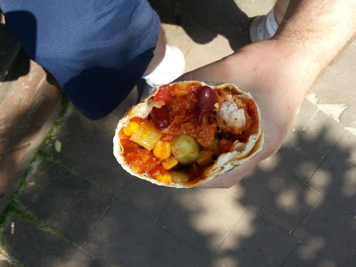 Gryzę. Ogórek, pomidor, sałata, czerwona fasola, kukurydza, papryka peperoni, kurczak w panierce (kawałki), sos. Sos na szczęście nie piekielny, ale jak na meksykańską wersję przystało, daje trochę popalić. Dosłownie, bo jest bardziej palący niż ostry. Jednak w zestawie ze świeżymi warzywami jest to pieczenie odpowiednie dla osoby lubiącej ostrą kuchnię. Kurczak wyczuwalny, ale mam wrażenie, że pierwsze skrzypce w tej tortilli grają jednak warzywa. W smaku tortilla naprawdę dobra, sos spełnia swoje zadanie doskonale, a całość nasyca.