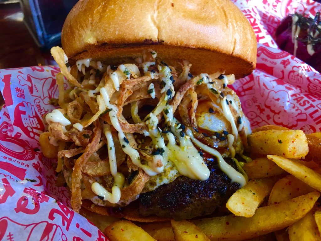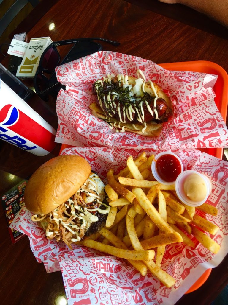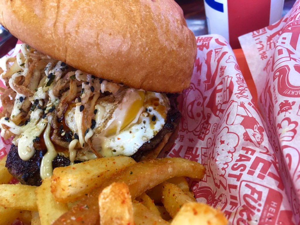 Po chwili namysłu wybraliśmy Tamago Burgera w zestawie z Togarashi Garlic Fries oraz Naga Dog. Muszę przyznać, że zestawienie składników w burgerach bardzo nam się podobało, w Polsce zjecie coś podobnego w food trucku i lokalu Azja w Bule w Warszawie. Jak sie potem okazało, Tamago Burger był chyba najmniej japoński, niemniej bardzo mi smakował. Ale po kolei.