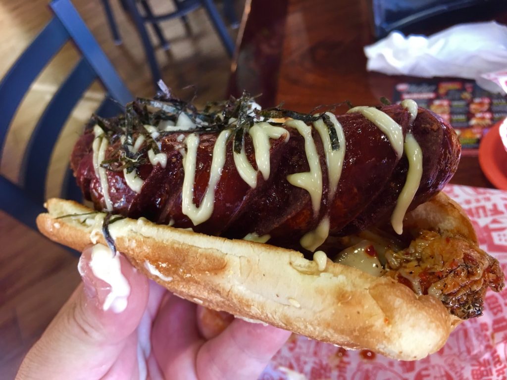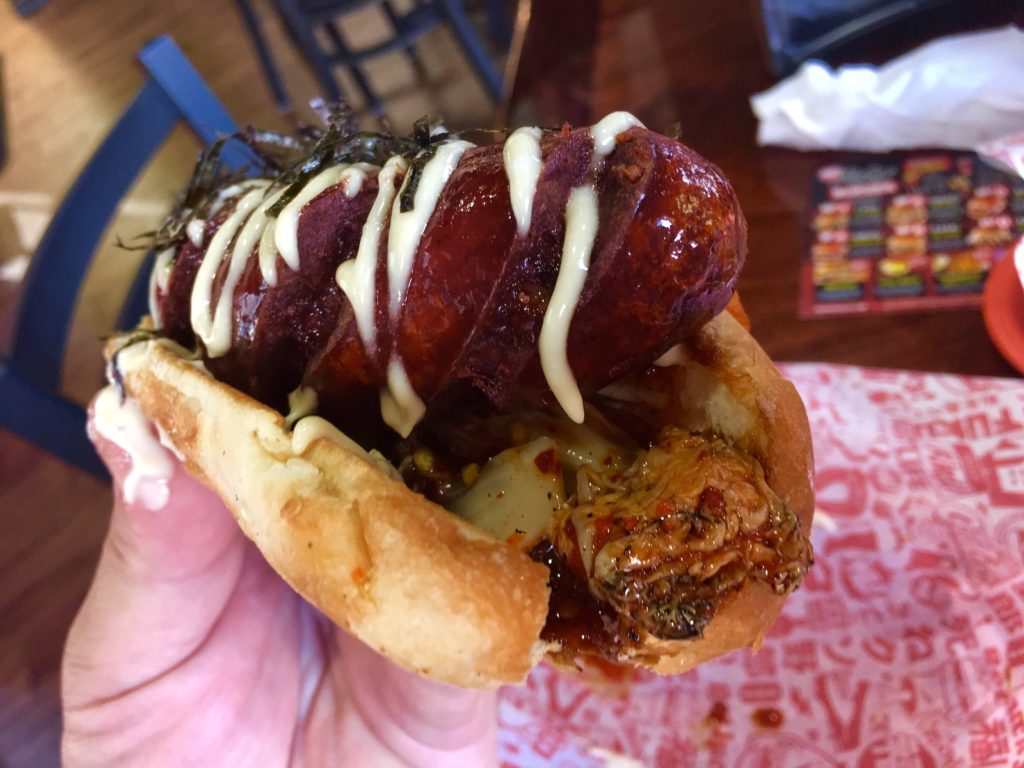 Na koniec Naga Dog. Tutaj fusion azjatycko-amerykański czuć w każdym kęsie. Doskonała, mocna w smaku, soczysta wołowa kiełbaska, zgrilowane wyraziste kimchi, relish z rzodkwi japońskiej, sos kabayaki z grilowanych ości węgorza, wina ryżowego, cukru i sosu sojowego wzmocniony papryczką habanero, a całość przybrana wodorostami kizami nori.