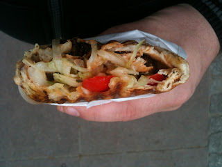 A więc zamówiłem mały kebab z kurczaka w cieście z sosem mieszanym. Zapłaciłem 8 zł i czekam. Cieniutkie ciasto wypełnione zostało kawałkami kurczaka, surówkami (w tym tartą w paski marchewką) i sosami. Po napełnieniu całość wylądowała jeszcze na elektrycznym grillu. Po kilku minutach odebrałem swoje zamówienie i wyszedłem, by spożyć, jak street foodowa tradycja nakazuje, na ulicy.