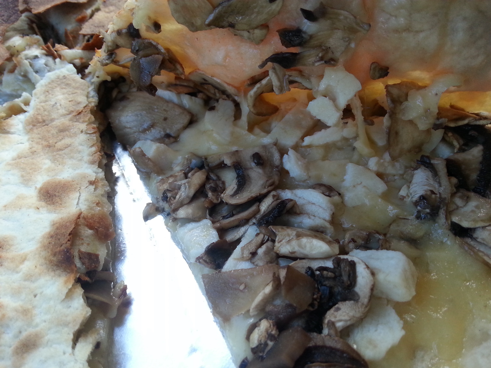 Pierwsze wrażenie – jest duża. Średnica na oko 30 cm, zresztą przyjechała w pudełku na pizzę, a mała pizza w Da Grasso ma 32 cm. Wrażenie nr 2 – jest gorąca, chrupiąca, sera dużo i ciągnie się przyzwoicie, czuć kurczaka, ale pieczarki wyraźniej. Całość soczysta, ale nie mokra – nic się po palcach nie lało. Wrażenie nr 3 – quesa smakuje jak pizza. Placki smakiem przypominały raczej cieniutkie ciasto pizzowe niż tradycyjne tortille. Podejrzewam, że quesa wyszła z pieca do pizzy, stąd ten smak i brak „mokrości” grzybów. Porcja solidna, sycąca i smaczna. Gdybym miał szukać czegoś do poprawy to użyłbym może wyrazistszego sera albo podostrzył smak dodając papryczki.