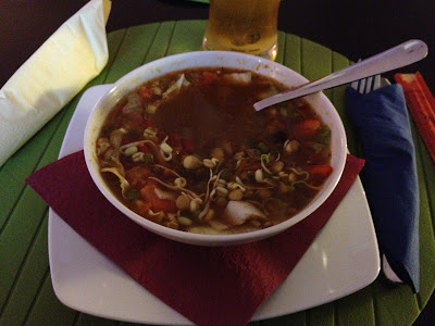 Jako zwolennik wszystkiego co wypala kubki smakowe, postanowiłem iść na żywioł. Z karty na przystawkę wybrałem kwaśno-pikantną zupę z makaronem sojowym, trawką cytrynową, kolendrą i owocem tamaryndowca (w menu widnieje jako pikantna). Jako, że w planach miałem zjeść coś jeszcze, zdecydowałem się na wersję z warzywami. Cena 7 PLN.
