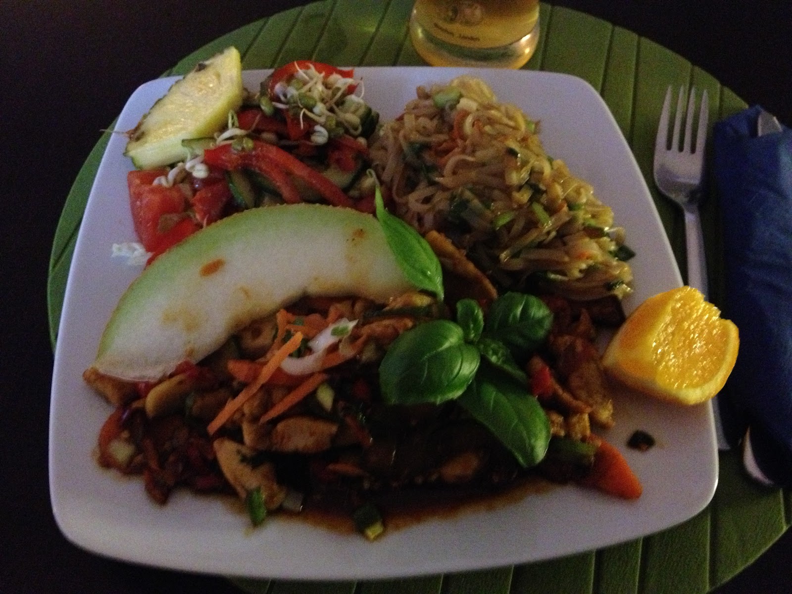 Danie na woku ze świeżym chili, imbirem, ziołami i sosami tajskimi (w cenie 27 PLN) okazało się godnym przeciwnikiem. Wybrałem wersję z kurczakiem i makaronem ryżowym. Jak widać na zdjęciu, jako dodatki do dań obsługa podaje sałatkę z sosem vinaigrette oraz kawałki owoców tropikalnych jeśli ktoś ma ochotę oczyścić podniebienie po posiłku. Nie każdemu coś takiego przypadnie do gustu, ja odebrałem to jako miły gest.