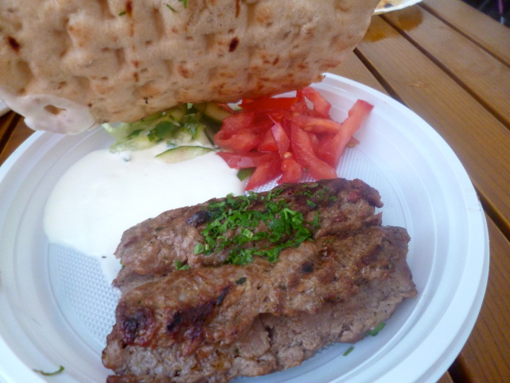 Kebab okazał się rewelacyjny. Delikatna, świetnie doprawiona jagnięcina przebywała na grillu dokładnie tyle, ile potrzeba by mięso się ścięło, ale zachowało wszystkie soki. W towarzystwie lekkiego jogurtu, świeżego ogórka i pomidora smakowała przepysznie, a całości dopełniała gorąca pita, którą przegryzaliśmy mięso i zbieraliśmy z talerzyka sos i jogurt.