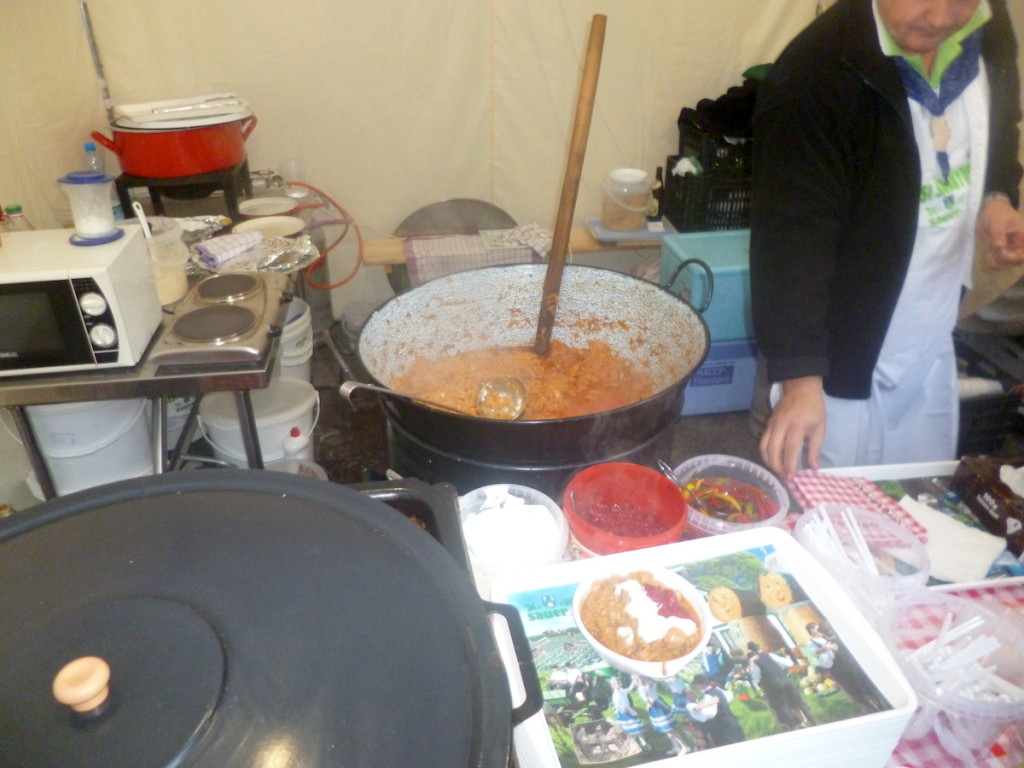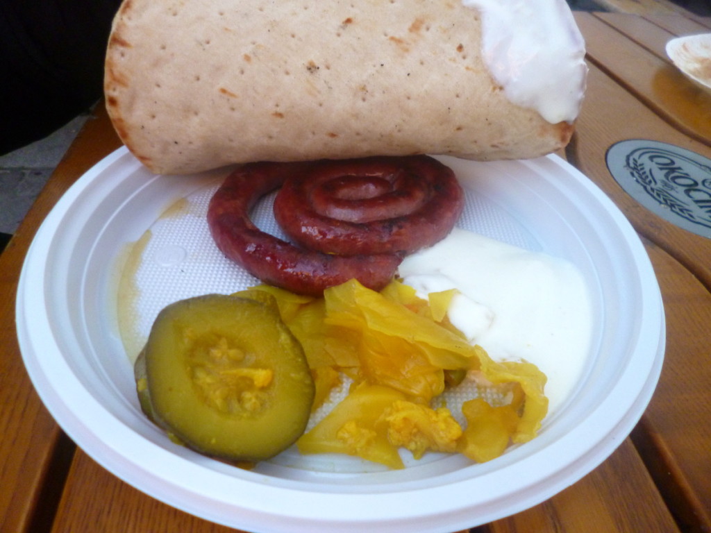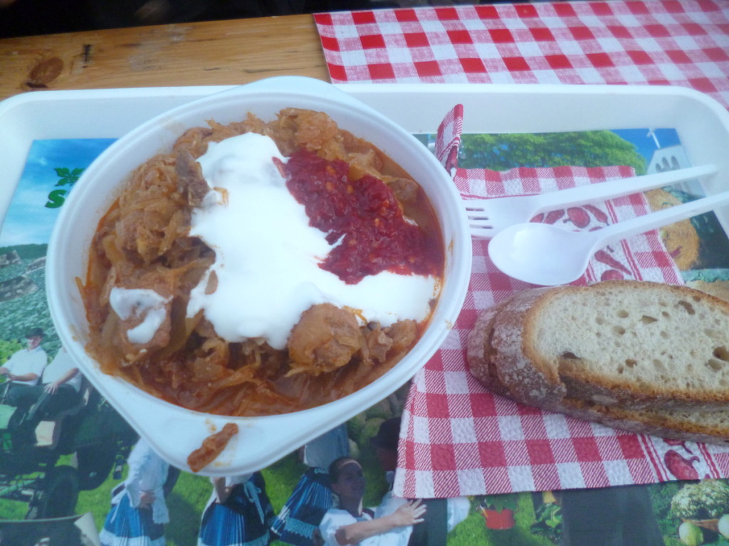 Po kurdyjskich specjałach przyszła pora na moją ukochaną kuchnię, czyli coś po węgiersku. Nasi bratankowie od szklanki i szabli zajmowali dwa stoiska. Na jednym serwowali gulasz z kapustą i naleśniki, na drugim nabyć można było węgierskie kiszonki i pasty. Wzięliśmy porcję gulaszu z chlebem (20 zł).