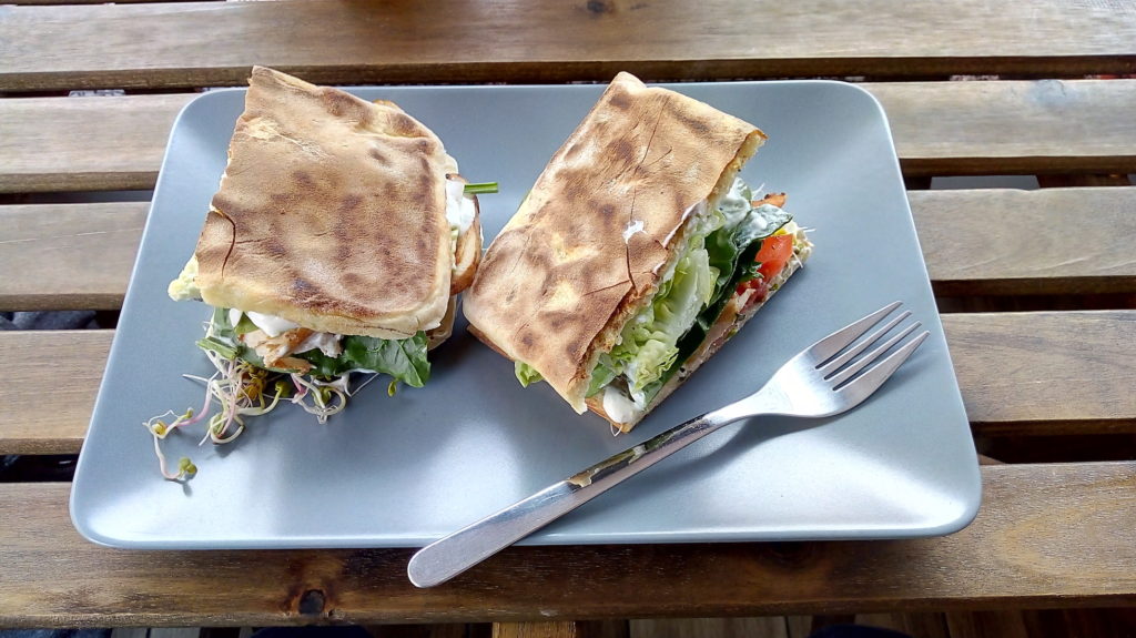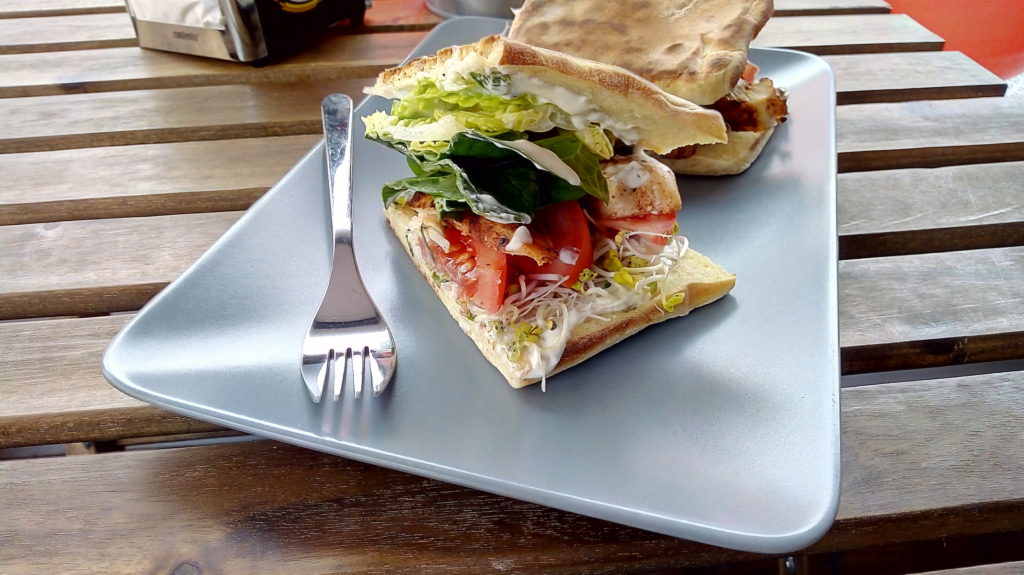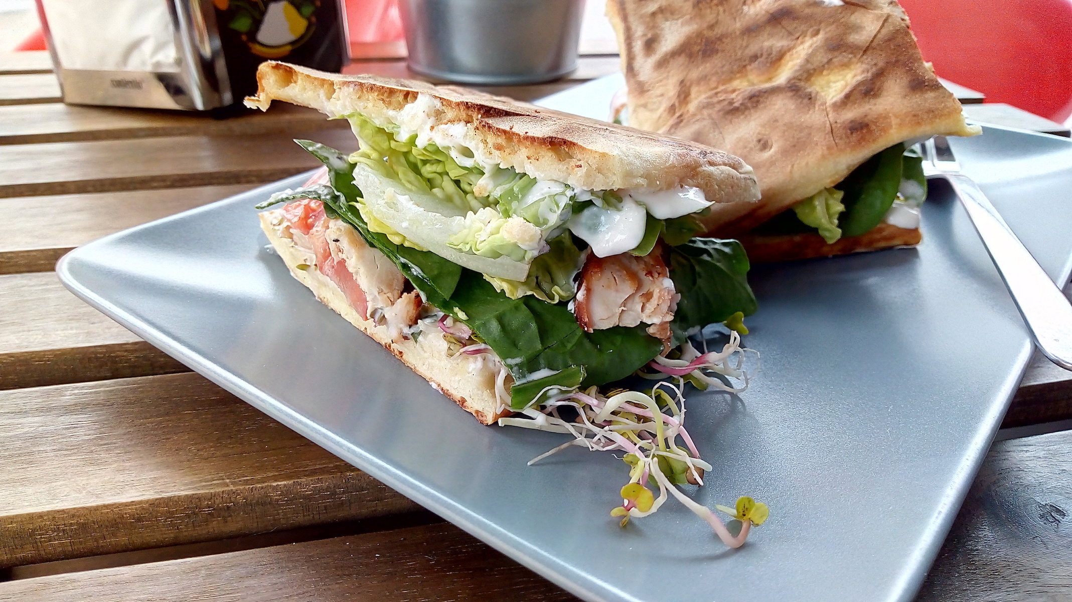 Zdecydowałem się na lekką mieszankę, w której skład wchodził grillowany kurczak, sałata lodowa, baby szpinak, pomidor, kiełki rzodkiewki i autorski sos na bazie jogurtu greckiego (cena 16 zł). To co otrzymałem na talerzu zaskoczyło mnie pozytywnie. Proziak jest prostokątny, przekrojony na dwie części i nie grzeszy skromnym wkładem. Placek jest ładnie wypieczony z zewnątrz, odpowiednio chrupki, zaś środek wzorowo miękki. Po pierwszym gryzie jest dobrze. Grillowany kurczak nie jest suchy, ale zabrakło w nim większej soczystości. Warzywne dodatki są świeże, chrupiące i razem z sosem odpowiednio nawilżają całość. Za każdym kolejnym gryzem smaki powtarzały się 1:1 i tak było do samego końca. Dwa razy zdarzyło się, że kawałek pomidora i kurczaka spadł mi na talerz – myślę, że jakby proziak byłby bardziej sprasowany z dodatkami to można byłoby zapomnieć o tego typu szczegółach. Mam jednak na uwadze, że proziaki w formie otwartej (tj. podwójnej kanapki) mają prawo ulegać grawitacji :)