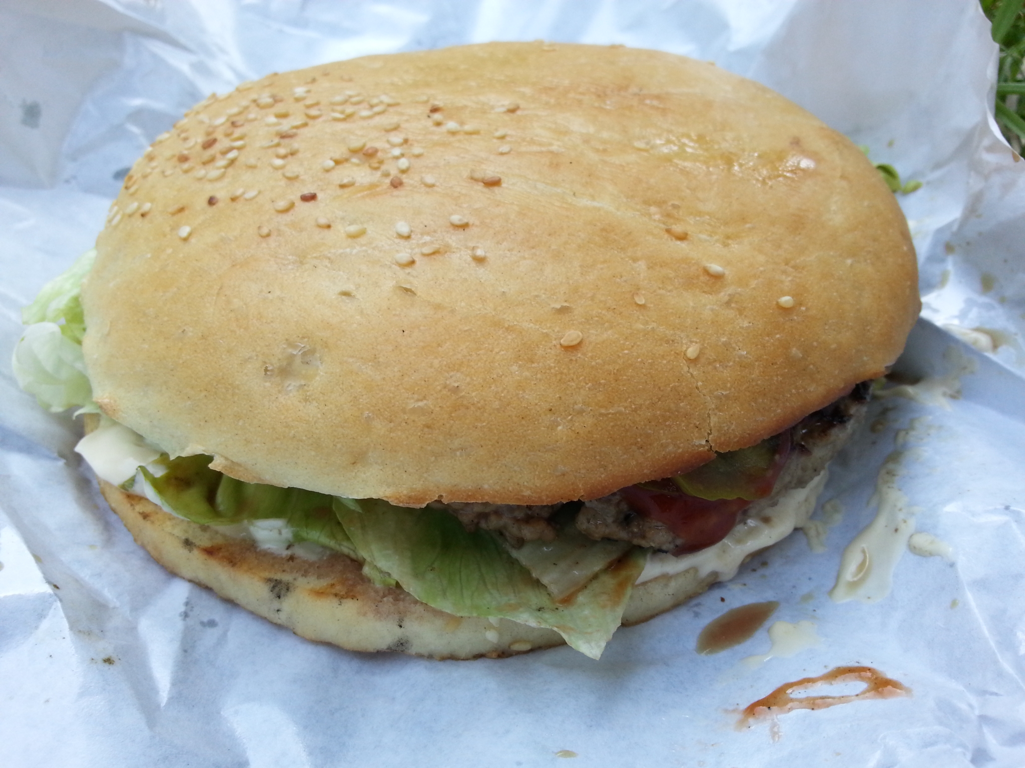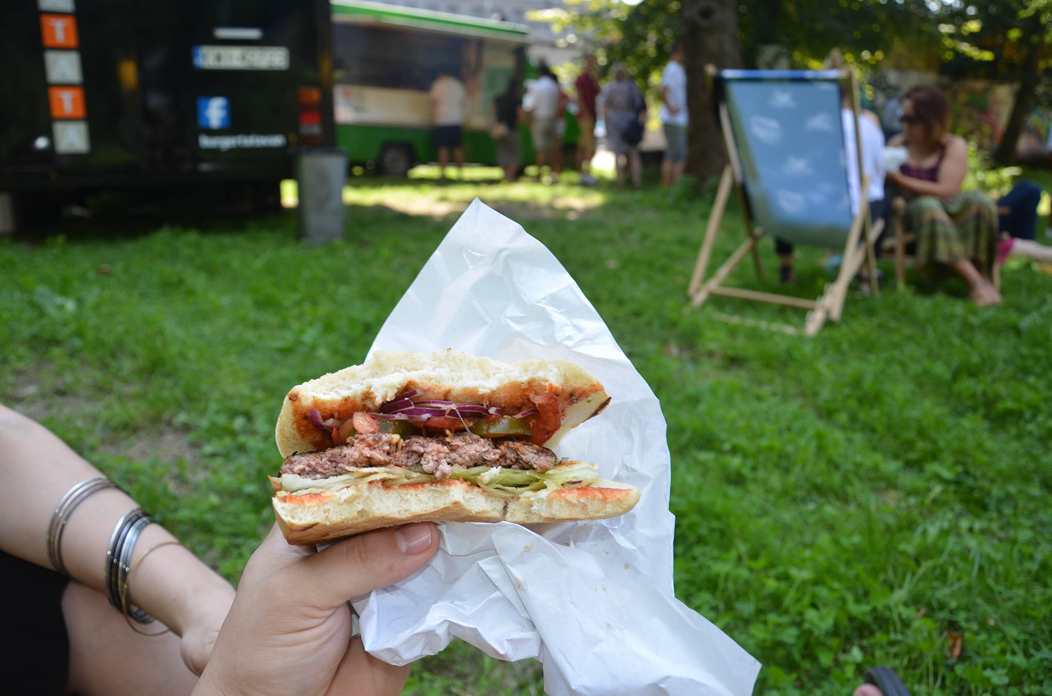 Wybraliśmy się z Małżonką popróbować co nieco. Trucki stały obok siebie, atmosfera przyjazna, zapachy wspaniałe, więc szybki rzut okiem na menu i składamy zamówienie, dla Małżonki Cheese od SSF → wołowina, ser żółty, ogórek konserwowy, sałata, czerwona cebula, majonez, ketchup, dla mnie zaś od Burgertaty Fire Starter → wołowina, papryczki jalapenos, sos chilli sriracha, sałata, pomidor, czerwona cebula – obie propozycje 15 złotych polskich.