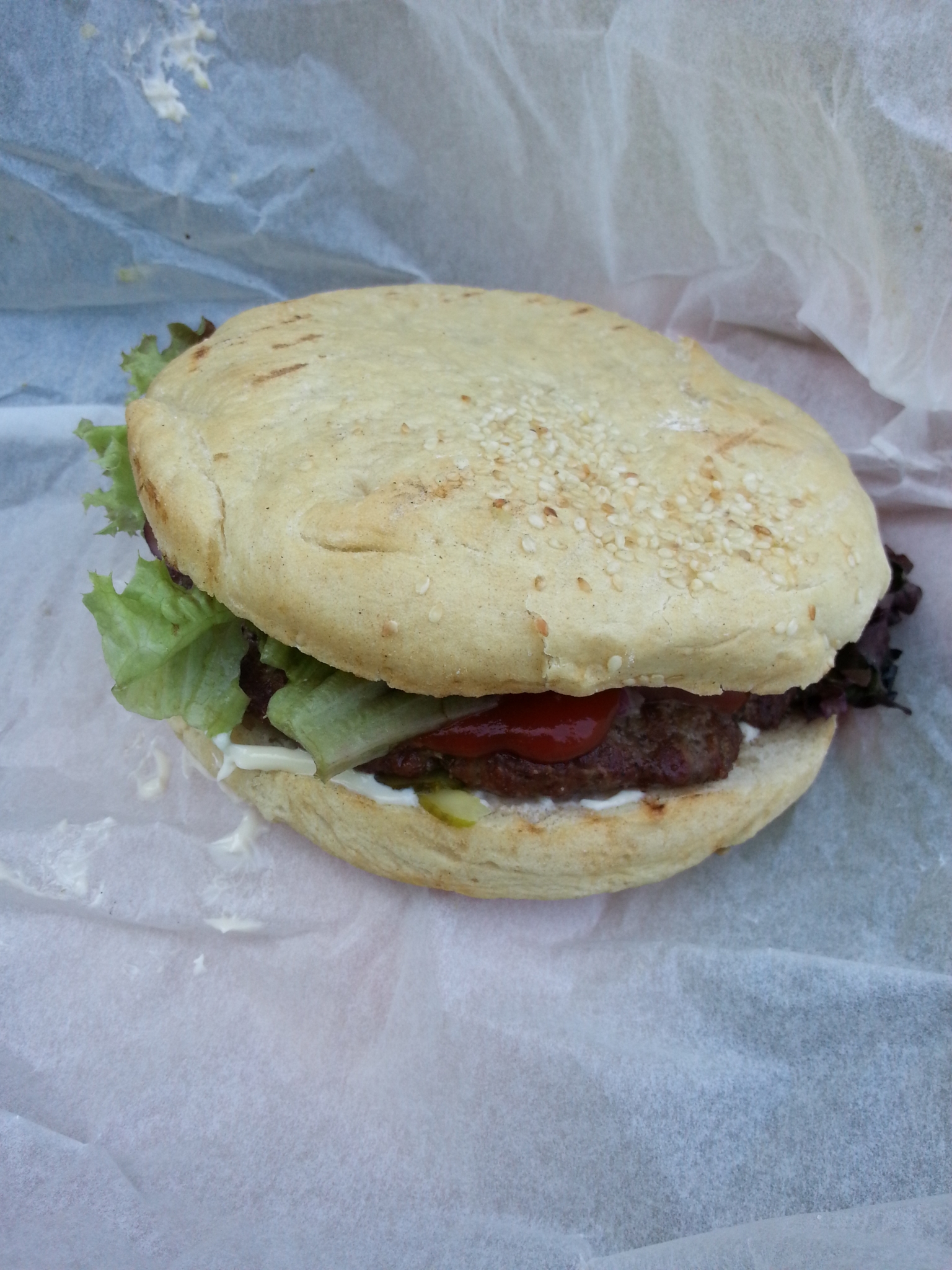 Dodatki rozbieżne → jalapenos (Burgertata, jaka jest, każdy widzi, na pewno jednak było jej mniej, niż w Nowy Kleparz Burger czy Krakowski Grillowany Burger), ogórek konserwowy (SSF, cieniutkie plasterki, w obecności majonezu ginęły), ser żółty (SSF, całkiem smaczny, w części burgera fajnie zatopiony, jednak z drugiej strony mięsa, w miejscu, gdzie plasterki na siebie naszły – nie roztopiony, przez co mniej apetyczny)