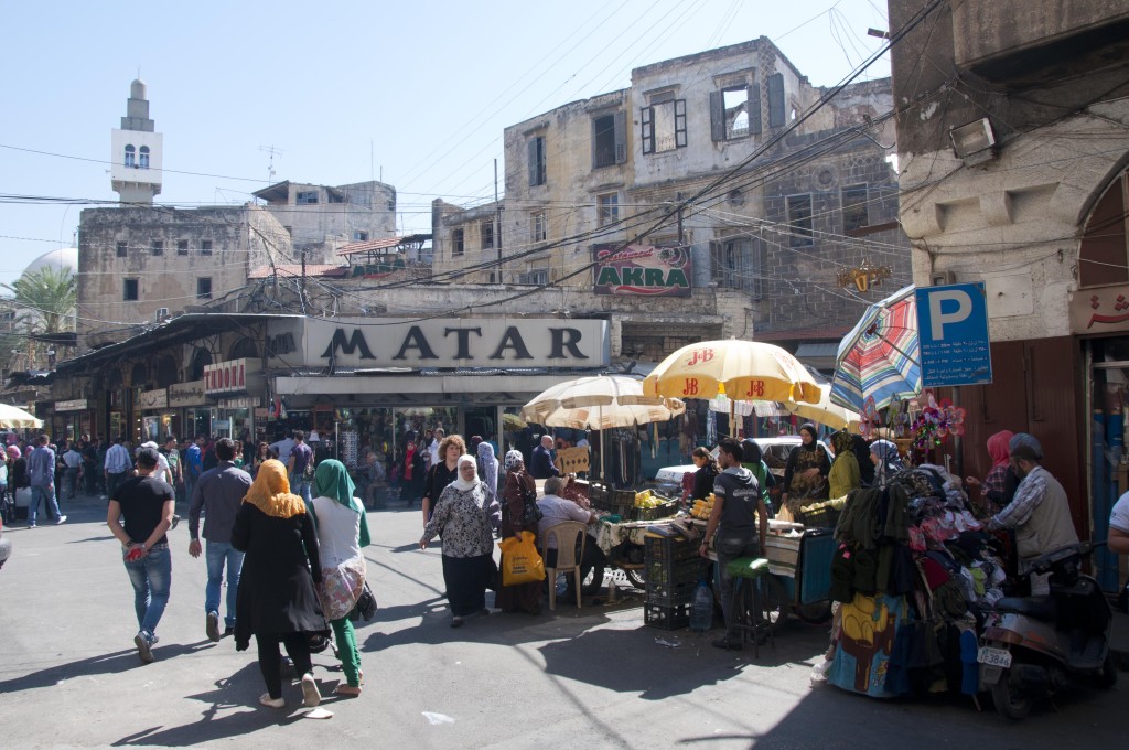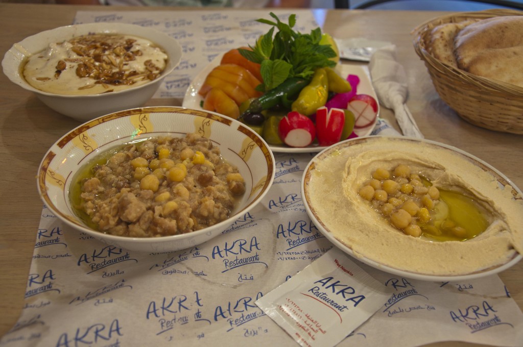 Prawdziwa strączkowa uczta czekała nas jednak dopiero w Tripoli na północy Libanu. Nie jest to miasto w najmniejszym nawet stopniu turystyczne, z uwagi na stojące na ulicach czołgi, zasieki z drutu kolczastego i zwisające ze ścian zrujnowanych kamienic portrety groźnych panów z karabinami. Nie musieliśmy się zatem obawiać, że gdziekolwiek trafimy na turystyczną breję w kosmicznych cenach. I tak trafiliśmy do Akry – sporych rozmiarów restauracji karmiącej wewnątrz jednego z souków. Obsługa nie znająca innego języka niż ojczysty nadrabiała szerokim uśmiechem i nadużywanym w tym kraju „welcome”. Menu nie było, pokazali za to palcem, że wszystkie potrawy wypisane są na papierowej podkładce, którą kelner rozłożył na stoliku. Zapytani czy chcemy humus grzecznie przytaknęliśmy, podobnie jak na dwie inne, nie do końca zrozumiałe propozycje. Okazało się, że był to bardzo dobry wybór, bo prawdopodobnie jedyny – trzy miseczki ze strączkową zawartością stały na każdym z kilkunastu zajętych stolików wokół. Oprócz samego hummusu, pity i tradycyjnego zestawu warzyw wjechały także fattet hummus (mieszanka hummusu, ziaren ciecierzycy, kawałków pity – wszystko zalane jogurtem) oraz niezidentyfikowana dotychczas potrawa widoczna na zdjęciu, z ciecierzycą oczywiście – ktoś wie co to jest? :)