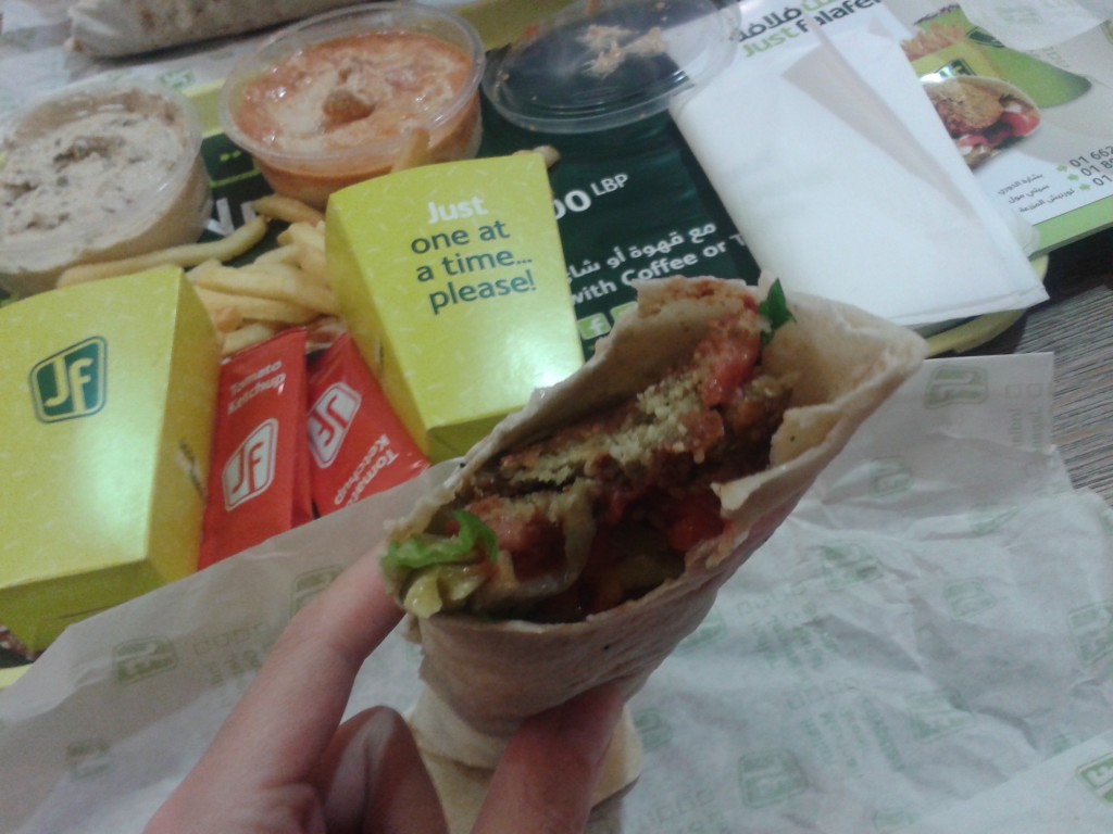 Nieco mniejszym zainteresowaniem cieszyła się w Bejrucie sieciówka „Just Falafel”, która okazała się jedynym miejscem w centrum handlowym serwującym coś lokalnego. To nic innego jak fastfood wege oferujący smażone kulki z ciecierzycy (lub suszonego bobu) na różne sposoby. Skusiliśmy się na falafel w wersji indyjskiej i egipskiej zawinięte w razową tortillę (saj), podane jak przystało na fastfood z frytkami i pepsi. Skusił nas też hummus na ostro z jalapeno oraz nieco łagodniejszy z suszonymi pomidorami. Falafel egipski i indyjski różniły się właściwie tylko sosami – pierwszy przypominał trochę majonez (ale daleko mu do kieleckiego ;) drugi nieco pikantne curry. Moje obawy o to, że będzie to coś suchego, zapychającego i bez smaku nie sprawdziły się – same kulki były bardzo aromatyczne, a całość w niczym nie ustępowała mięsnym wersjom tortilli. Jak widać wege nie musi oznaczać czegoś nudnego i zupełnie nie kłóci się z ideą fast-food :)