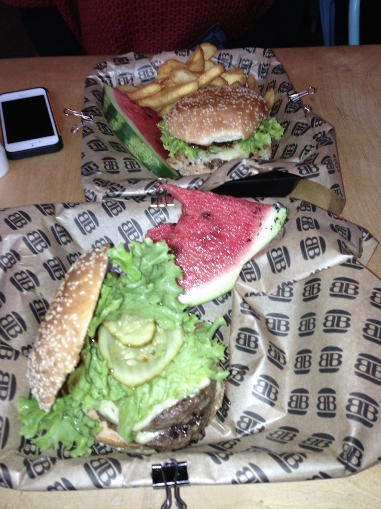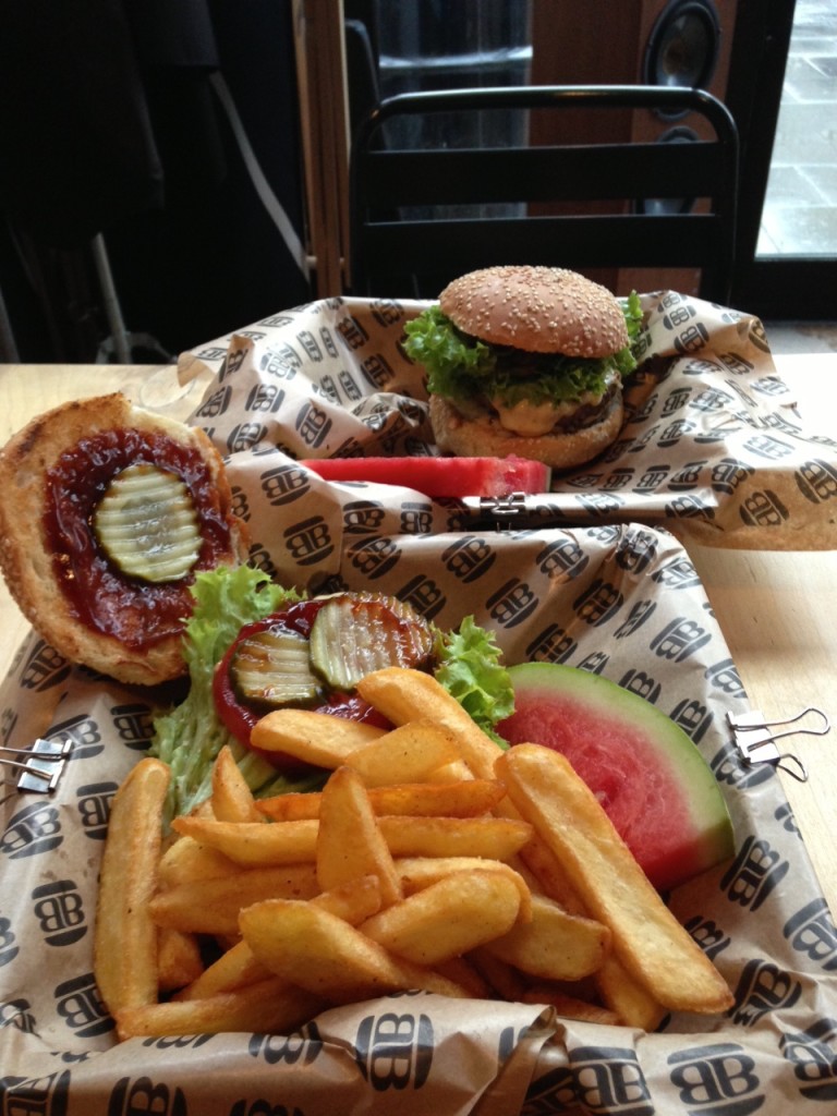 Bobby był na burgerowej mapie Warszawy prawie od początku, ja jednak trafiłem do niego dość późno. Za pierwszym razem, czyli na początku października, burgery mnie tam zachwyciły. Na pierwszy ogień poszedł klasyczny cheeseburger, czyli 120gr wołowiny, sałata, ser, pomidor oraz ogórek. Idealne w swojej prostocie dodatki. Wtedy wszystko było po prostu perfekcyjne – burgerowa bułka z sezamem, delikatnie chrupiąca z zewnątrz, miękka w środku, mięso – chociaż nikt nie pytał, usmażone na tzw. medium, sos BBQ delikatnie ostry, fajnie podkręcał smak mięsa, warzywa również były świeże. Całość dopełniona poprawnie ciągnącym się serem. Wszystko to podane z grubymi frytkami posypanymi papryką kosztuje 16zł (sam burger 12zł ). Za tą cenę otrzymujemy może nie największego na świecie burgera, ale w zestawie z frytkami oraz owocem ( zawsze dodają, jak nie w korytku, to na ladzie, jakiś owoc – bardzo miły gest ), całkiem przyjemną porcję. Możemy zamówić oczywiście podwójnego burgera, 2 x 120gr, wtedy cena wzrośnie o 5-6zł.