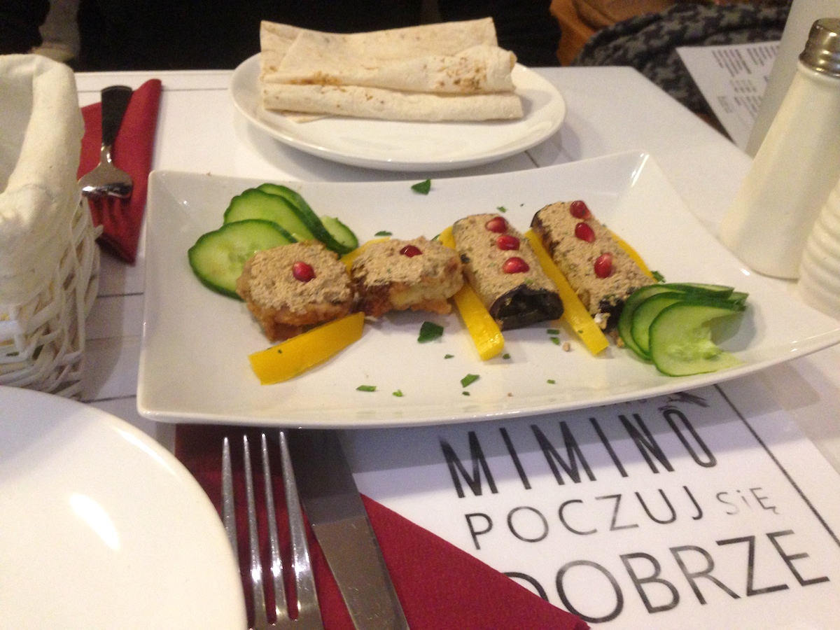 Robiąc sobie małą odmianę od burgerów, postanowiłem sprawdzić parę lokali z kuchnią pochodzącą z kraju, który zaczął mnie niedawno fascynować – Gruzji. Na pierwszy rzut poszła świeżo otwarta, prowadzona przez mieszkającego w Polsce Ormianina, restauracja Mimino. Sam lokal zlokalizowany jest prawie w centrum Warszawy, w środku znajdziemy klasyczny, aczkolwiek elegancki wystrój. Wziąłem ze sobą dzielnego giermka – pomagiera, aby spróbować większej ilości potraw, dzięki czemu udało mi się spróbować aż 6 pozycji z karty. Zaczęliśmy od dwóch przystawek sprzedawanych na sztuki – Badrijani, czyli bakłażan z orzechami oraz Soko, czyli grzyby z orzechami zapiekane przyprawami gruzińskimi ( 4,5 zł/szt. ). Obie te przekąski podawane są na zimno wraz w koszyczkiem chlebka w rodzaju pity własnego wypieku. Nadzienie w obu przypadkach smakuje właściwie tak samo, jest to pasta z orzechów z lekkim posmakiem czosnku. Mi bardziej do gustu przypadł smak lekko słonego bakłażana, ponieważ ciekawie łamał słodkawy posmak orzechów.