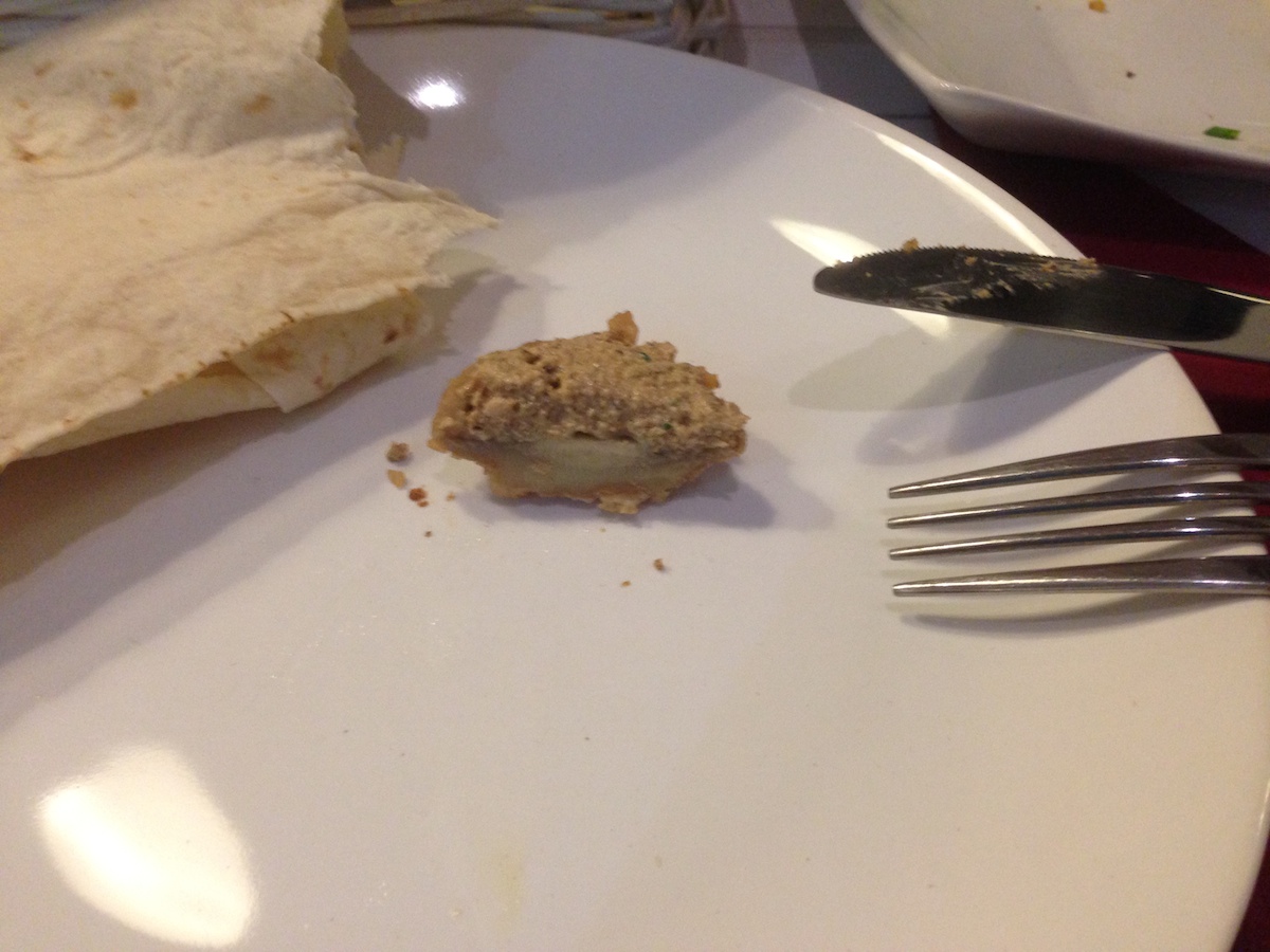 Kolejną potrawą, której było nam spróbwać był kebab ormiański (20zł), czyli siekana wołowina przyprawiona kolendrą kminkiem oraz papryką, którą oblepia się szaszłyki i grilluje. Wszystko to powstaje na naszych oczach, ponieważ grill zlokalizowany jest na sali. Gdy mięso jest gotowe, dodaje się do niego parę piórek cebuli i zawija w lawasz. Wszystko to podane jest z sosem paprykowym. Tutaj także dostajemy polecenie, żeby nie bawić się w krojenie tego, ponieważ środek jest ciepły, natomiast lawasz nie jest zbyt mocno podgrzewany, dzięki czemu można bez obawy wziąć kebab do ręki i maczając w sosie brać kolejne gryzy. W tym przypadku nie wiem, ale również mięso było fantastycznie soczyste i wspaniale przyprawione.