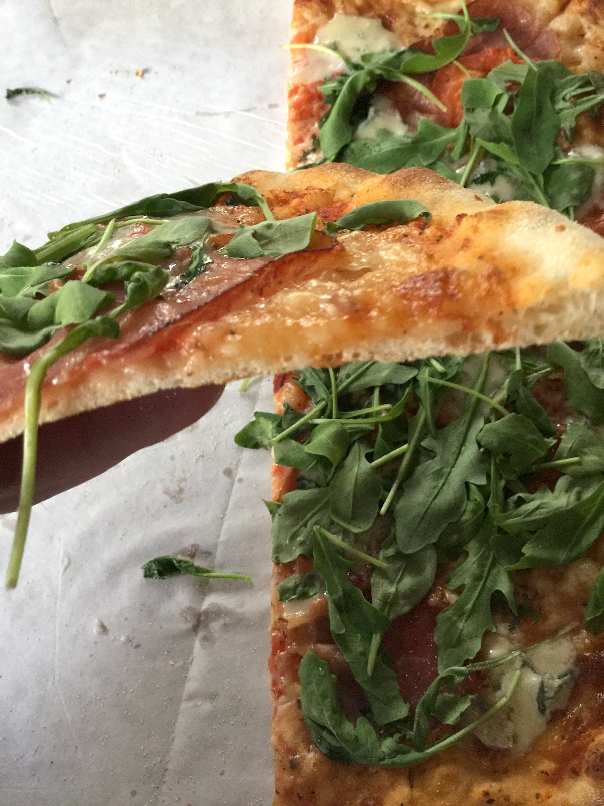 My zaczęliśmy od pizzy Speck e Gorgonzola. Speck to tutaj włoska wędlina, nie mylić z niemieckim speckiem! A więc: sos pelati, mozzarella, gorgonzola, pomidory rzymskie, speck i rukola. 33 zł za 45 cm.