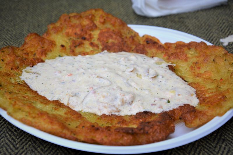 Ponieważ sporą część dnia spędziłam ze wspomnianym już wcześniej Irlandczykiem, Brytyjczykiem i Duńczykiem, próbowaliśmy tego, co dla nich jest dość nietypowe. Na stole wylądowały więc placki ziemniaczane z dość kwaśnym i, przynajmniej dla mnie, nieszczególnie pasującym do nich sosem oraz kiszka ziemniaczana z tym samym sosem. Dla mnie były ok, ale ponieważ możemy jedno i drugie znaleźć u nas (i to trochę lepiej doprawione), więc daruję sobie ocenę. Pobawiłam się też trochę w „ambasadora naszych” – stek od B.B. Kingsów – strzał w dziesiątkę. I nawet ogórek kiszony okazał się jadalny. Nerkami, wątróbką i sercami Walentego Kani też byli zachwyceni. Dla jednych – była to zupełna nowość, dla innych – przypomnienie smaków dzieciństwa, których próżno szukać już na przykład w Wielkiej Brytanii.