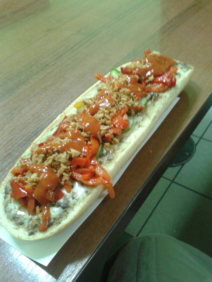 Menu to typowy fast food: hot-dogi, zapiekanki, hamburgery. Czystość stolików zdecydowanie nie zachęca do zjedzenia czegokolwiek. Sam zapach, mówiąc łagodnie, też nie jest czymś co jest pozytywną wizytówką tego miejsca. Ja jednak jestem twardy i postanawiam zamówić dwa dania. Brak mi odwagi na zamówienie Bigosu z kiełbasą (według reklamy jest on podobno specjalnością tego lokalu), ponieważ widzę jak jeden z klientów usiłuje jeść to danie i idzie mu to niezwykle topornie (i wcale się mu nie dziwię, bo bigos wyglądał co najmniej podejrzanie).