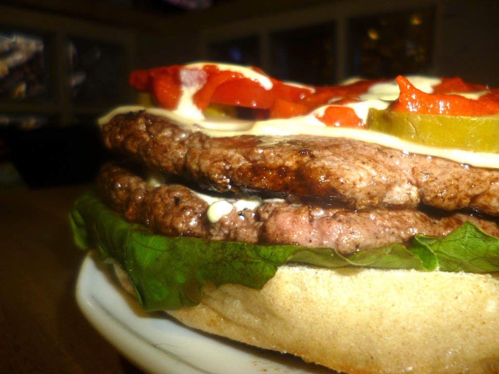 Znajdziemy tutaj sałatę, cebulę, pomidora i ogórka konserwowego, ser, sosy i dwa kotlety. Wysmażone tak jak prosiłem, czyli średnio. Warto zauważyć, że bułka nieco się zmieniła, ale tylko fizycznie. Jest nieco większa, ale nadal pieczona wg receptury opracowanej onegdaj przez Miśka dla Weź Mnie. Same kotlety są bardziej płaskie niż poprzednie, ale zwiększyły swoją średnicę. Doprawione tylko solą i posmarowane oliwą przed wrzuceniem na grill, zachowują idealną soczystość i to one dominują w smaku. Warzywa grają sobie w tle, nie przeszkadzają, razem z sosami dodatkowo nawilżają całość, ser to miły dodatek, ale przede wszystkim czuć w tym burgerze mięso. I tak powinno być i to mi się podoba. Absolutny must have dla każdego mięsożercy. Zero kompromisów – to prawdziwa mięsna uczta. Byłem na Bohodouble godzinę, może półtorej po obiedzie i to był błąd. Powiem szczerze, że wymiękłem i zostawiłem na talerzu około 1/4 bo po prostu nie dałem rady go zmieścić w żołądku. Na początku nie wydawał mi się specjalnie duży (pewnie przez płaskie kotlety), ale uwierzcie mi – to jest kanapka którą można się najeść. Polecam mięsożercom i głodomorom. 19 zł za to cudo to bardzo dobra cena biorąc pod uwagę smak, jakość składników i ilość jedzenia.