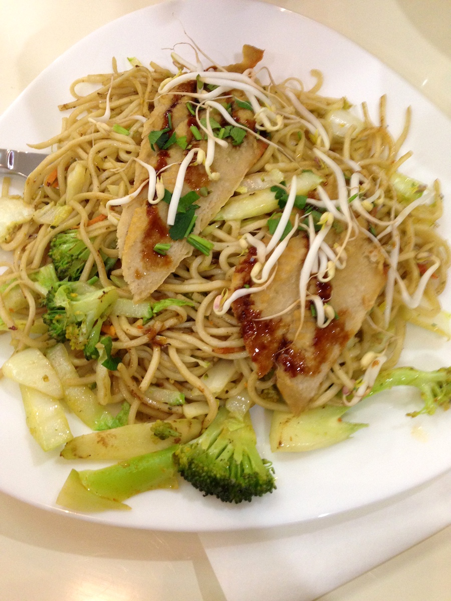 Jest to seitan, czyli gluten wypłukany z mąki pszennej, który potem marynujemy, tak aby nabrał smaku mięsa. Tak jak już pisałem wegańska wołowina w smaku prawdziwej wołowiny nie przypomina. Jest to zjadliwe, o ile ktoś lubi dużo intensywnych przypraw. Sam smażony makaron pszenny z warzywami był akurat całkiem smaczny. Znajdziemy tam kapustę, kiełki, marchewkę, brokuły – wraz z pszennym makaronem jest to nawet niezłe.