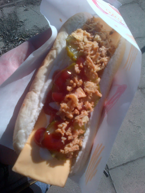 Szybki rzut oka na menu i decyzja zapadła: hot dog z serem. Mały, klasyczny, jak mi posmakuje to wezmę coś jeszcze. Koszt 4 zł (bez sera byłby za 3,50 zł). Po kilku chwilach odebrałem: