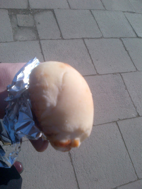 Parówka w cieście na szczęście była. Kosztuje 3 zł. Po złożeniu zamówienia trafiła do pieca, a po kilku chwilach w moje łapki:
